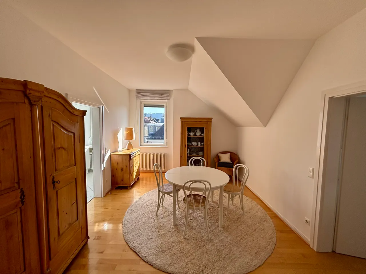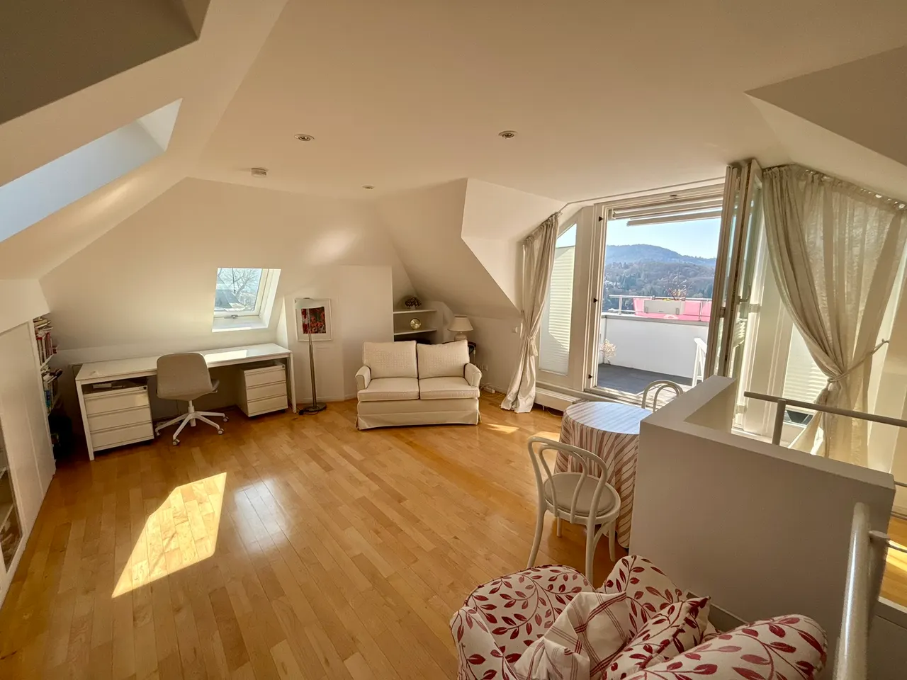 Ein ganz besonderes Highlight offenbart sich im oberen Geschoss: das lichtdurchflutete Studio mit Dachterrasse. Dieser außergewöhnliche Rückzugsort bietet Zugang zur sonnigen Süd-Dachterrasse und eröffnet ein Wohngefühl voller Freiheit und Weite. Großzügige Glasflächen lassen viel Tageslicht herein und geben den Blick auf die Umgebung frei – ein inspirierender Ort zum Arbeiten, Entspannen oder Träumen unter freiem Himmel.