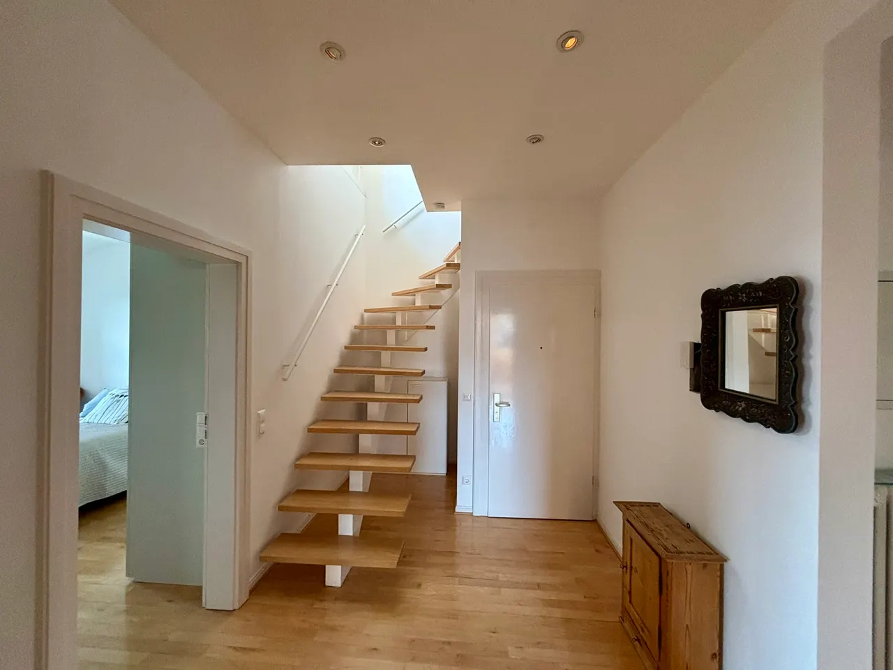 Bereits beim Betreten der Wohnung empfängt Sie ein lichtdurchfluteter, freundlicher Eingangsbereich, der mit einer maßgefertigten Garderobe stilvoll gestaltet ist. Angrenzend befinden sich ein Gäste-WC mit Fenster sowie ein tagesbelichtetes Badezimmer mit Dusche und Eckbadewanne – ein Ort der Entspannung, an dem Sie den Tag in wohltuender Ruhe ausklingen lassen können. Helle, zeitlose Fliesen unterstreichen das harmonische Gesamtbild.