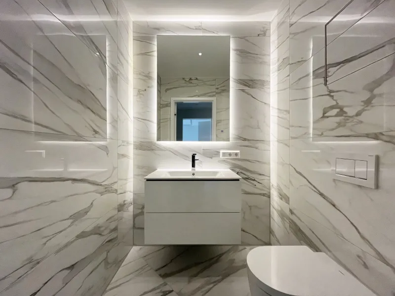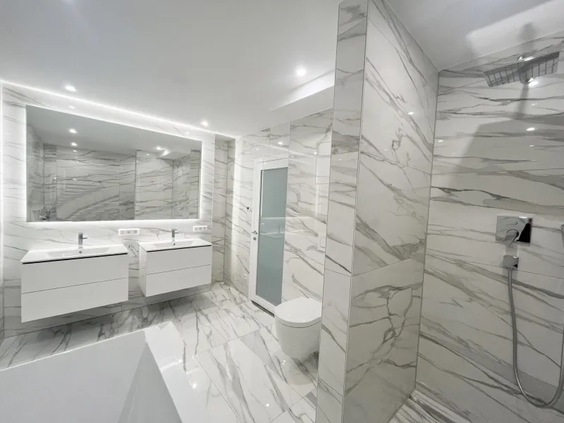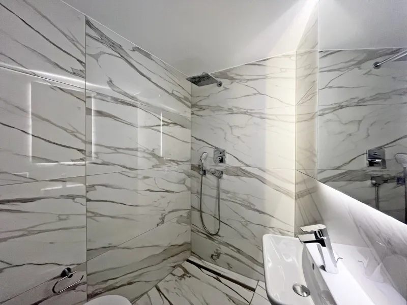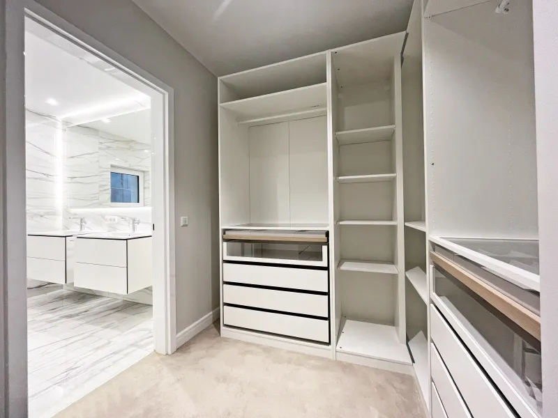 Bereits beim Betreten der Wohnung werden Sie von einem einladenden und repräsentativen Wohnbereich empfangen, der durch seine Exklusivität und stilvolle Atmosphäre begeistert. Auf der linken Seite des Wohnzimmers erwartet Sie das Hauptschlafzimmer mit einem angeschlossenen Ankleidezimmer sowie einem luxuriösen Badezimmer. Letzteres überzeugt mit edlen Marmorfliesen, einer ebenerdigen Dusche und einer stilvollen Badewanne, die zur vollkommenen Entspannung einlädt.